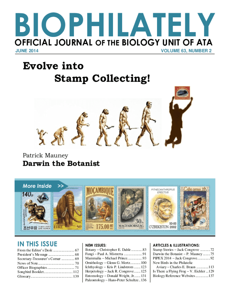 BIOPHILATELY OFFICIAL JOURNAL OF THE BIOLOGY UNIT OF ATA JUNE 2014VOLUME 63, NUMBER 2Evolve into Stamp Collecting!Patrick MauneyDarwin the Botanist More InsideIN THIS ISSUE From the Editors Desk ....................... 67 Presidents Message ............................ 68 SecretaryTreasurers Corner .............. 69 News of Note ....................................... 70 Officer Biographies ............................. 71 Songbird Booklet............................... 112 Glossary