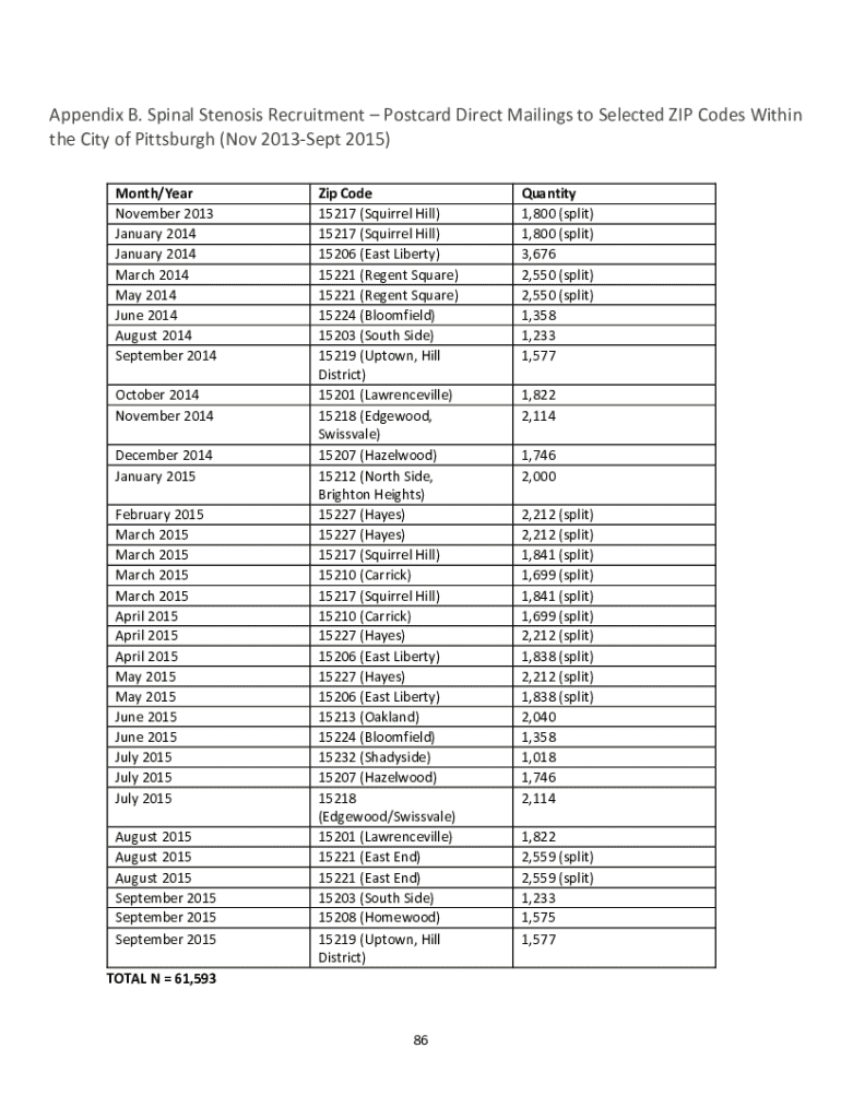 Discover the direct mail strategy for spinal stenosis recruitment in Pittsburgh from November 2013 to September 2015, targeting selected ZIP codes.