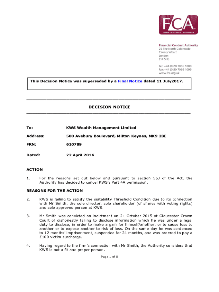Get the free UK Regulator Decision Notice to Cancel Investment ...