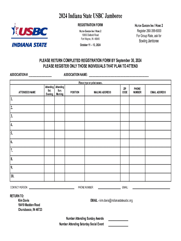 2024 Indiana State USB JamboreePLEASE RETURN COMPLETED REGISTRATION FORM BY September 30, 2024 PLEASE REGISTER ONLY THOSE INDIVIDUALS THAT PLAN TO ATTEND ASSOCIATION #: ___ASSOCIATION NAME: ___ Please