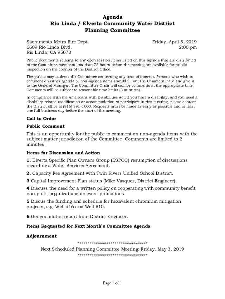 Agenda Rio Linda / Elverta Community Water District Planning Committee Sacramento Metro Fire Dept. 6609 Rio Linda Blvd. Rio Linda, CA 95673Friday, April 5, 2019 2:00 pmPublic documents relating to