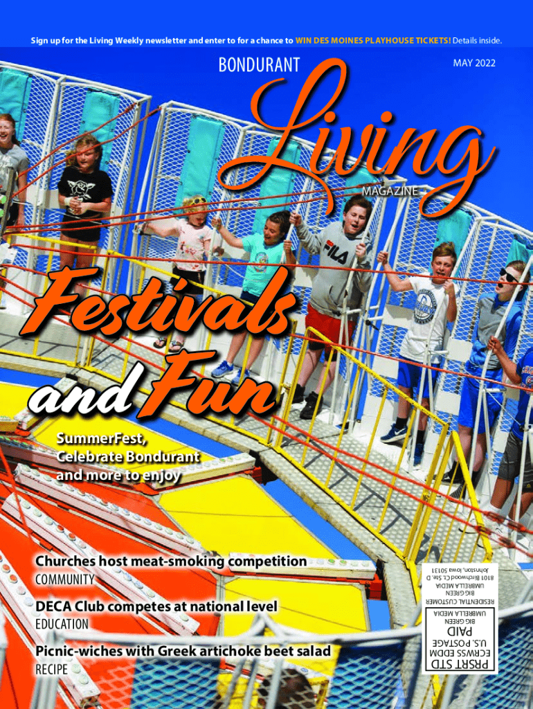 Sign up for the Living Weekly newsletter and enter to for a chance to WIN DES MOINES PLAYHOUSE TICKETS! Details inside.BONDURANTMAY 2022Living