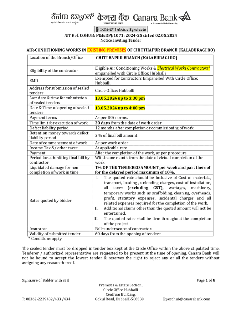 This document invites tenders for air-conditioning works at Chitthapur Branch, Kalaburagi RO, outlining eligibility, submission details, and payment terms.