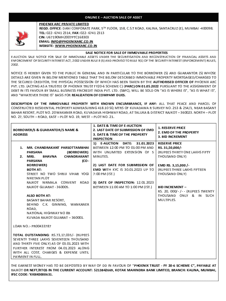 ONLINE E AUCTION SALE OF ASSET PHOENIX ARC PRIVATE LIMITED REGD. OFFICE: DANI CORPORATE PARK, 5TH FLOOR, 158, C.S.T ROAD, KALINA, SANTACRUZ (E), MUMBAI 400098. TEL: 022 6741 2314, FAX: 022 6741 2313