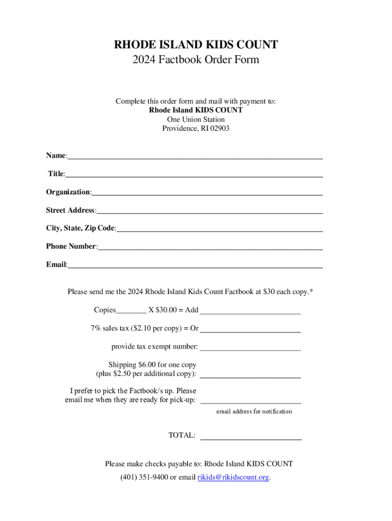 RHODE ISLAND KIDS COUNT 2024 Factbook Order FormComplete this order form and mail with payment to: Rhode Island KIDS COUNT One Union Station Providence, RI 02903Name: Title: Organization: Street Address: