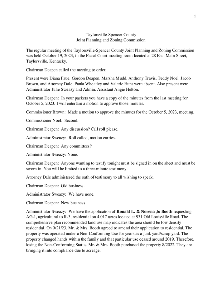 Minutes from the Taylorsville-Spencer County Zoning Commission meeting on October 19, 2023, covering zoning applications and land use discussions.