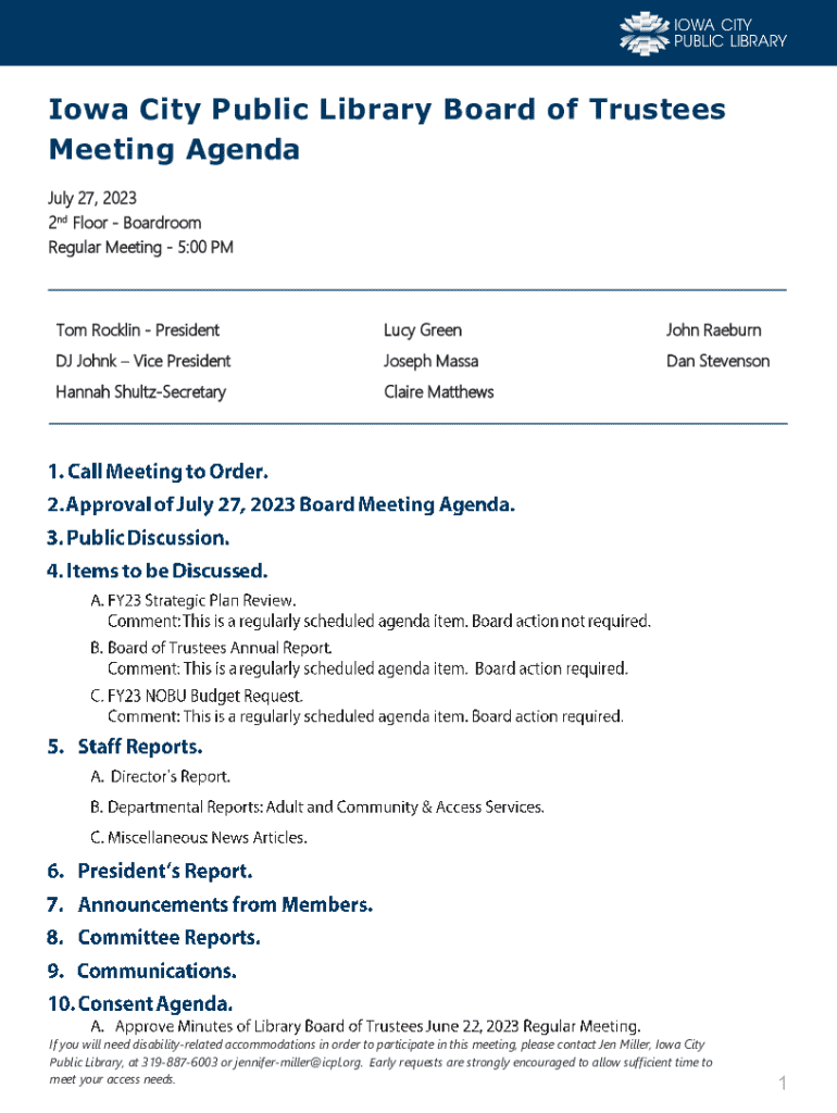 Iowa City Public Library Board of Trustees Meeting Agenda July 27, 2023 2nd Floor Boardroom Regular Meeting 5:00 PM Tom Rocking President Lucy Green John Rayburn JohnkJoseph Masada StevensonVice President