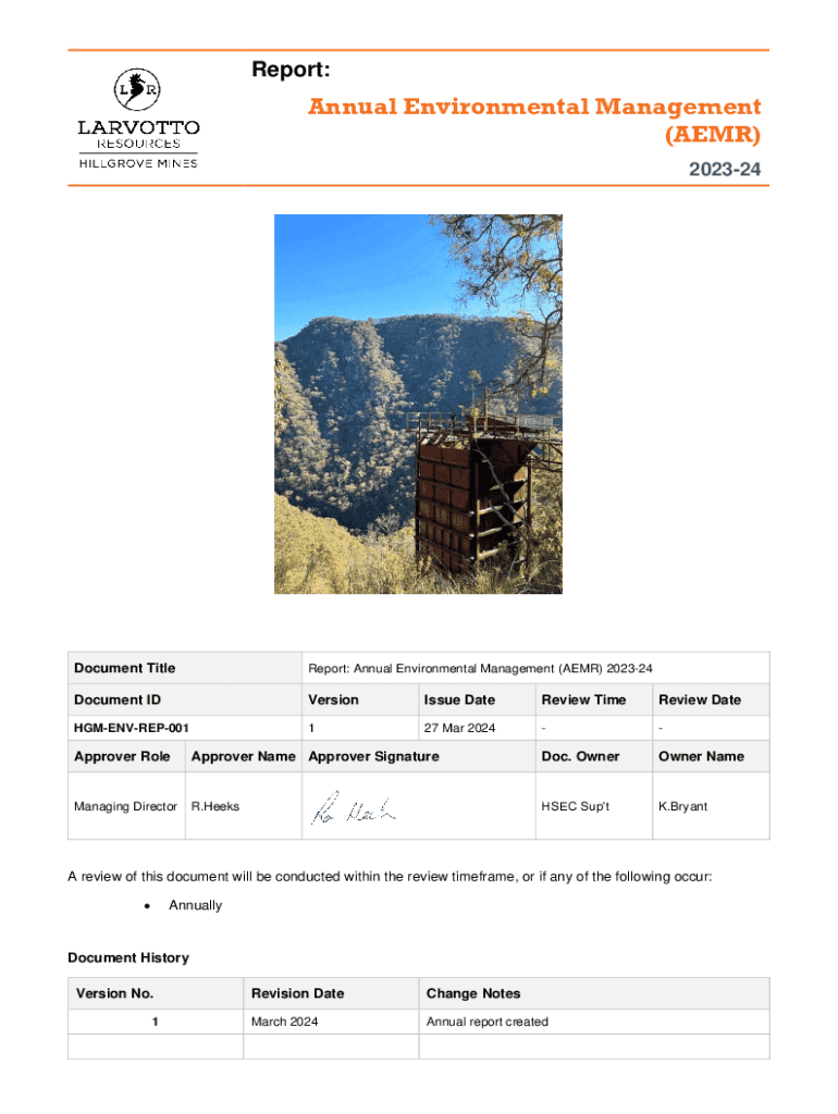 Report:Annual Environmental Management (AEMR) 202324Document TitleReport: Annual Environmental Management (AEMR) 202324Document IDVersionIssue DateReview TimeReview DateHGMENVREP001127 Mar 2024Approver RoleApprover Name Approver SignatureDoc. OwnerOwner NameManaging DirectorR.HeeksHSEC SuptK.BryantA review of this document will be conducted within the review timeframe, or if any of the following occur: AnnuallyDocument History Version No