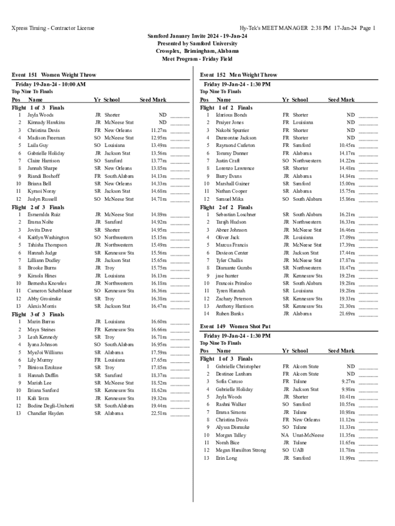 Explore the Samford January Invite 2024 meet program showcasing track and field events including weights and shot put, featuring athletes from various universities.