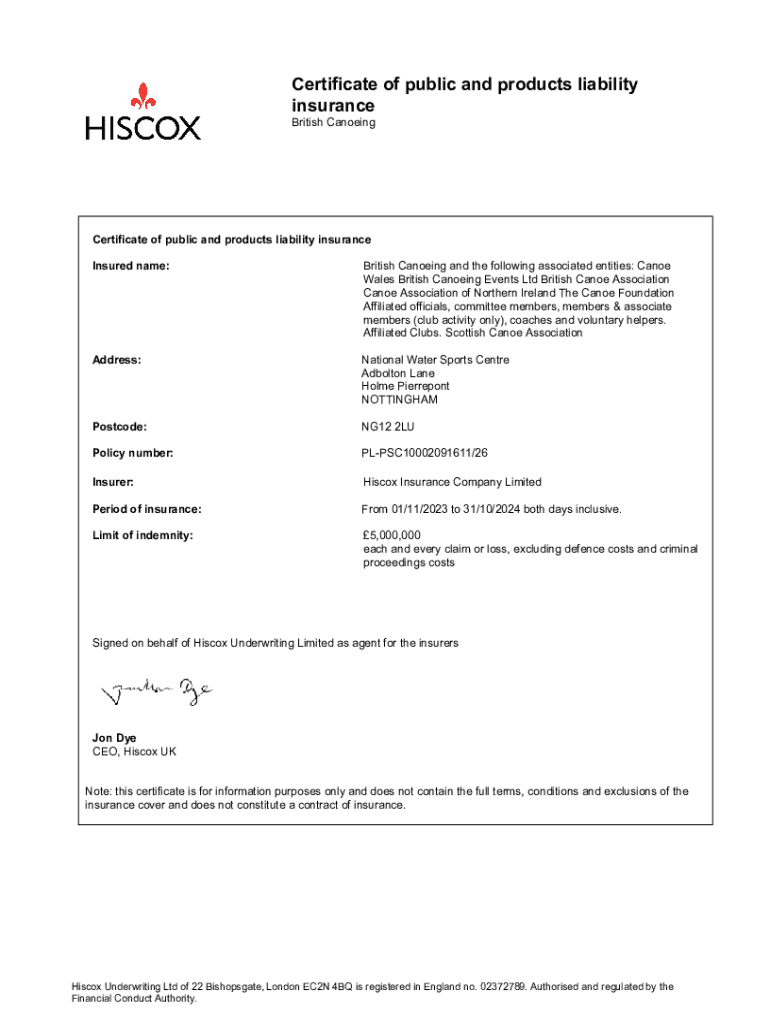 This certificate outlines the public and products liability insurance for British Canoeing, covering various associated entities with a £5M limit from 2023 to 2024.