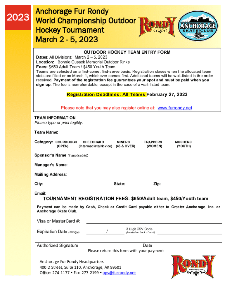 Register for the 2023 Anchorage Fur Randy World Championship Outdoor Hockey Tournament. Events from March 2-5 with registration closing on February 27.