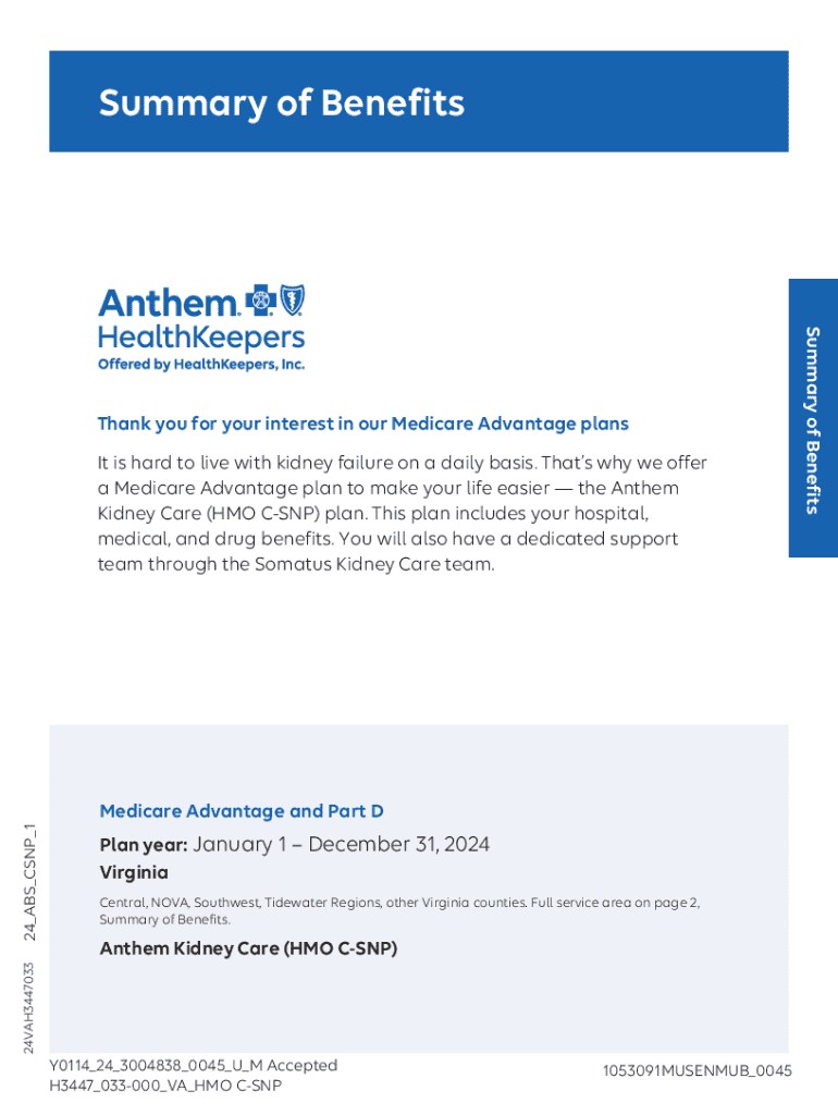 Summary of BenefitsIt is hard to live with kidney failure on a daily basis. Thats why we offer a Medicare Advantage plan to make your life easier the Anthem Kidney Care (HMO CSNP) plan. This plan