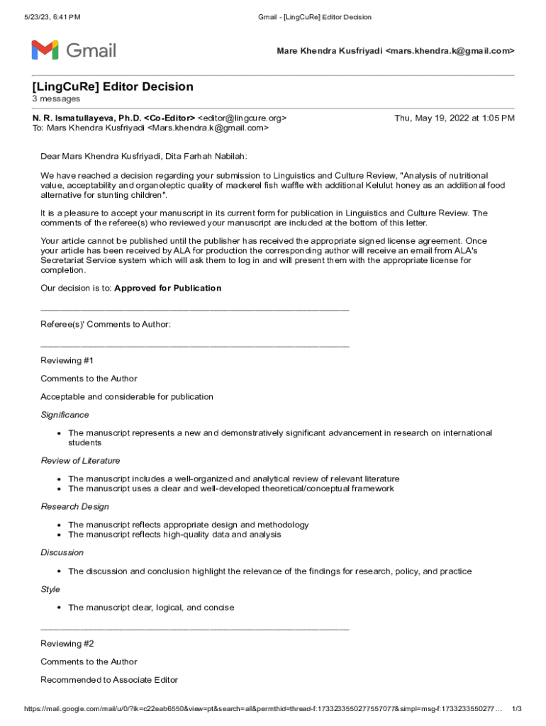This document details the acceptance of a manuscript on mackerel fish waffle, emphasizing nutritional value for stunting children, approved for publication in 2022.