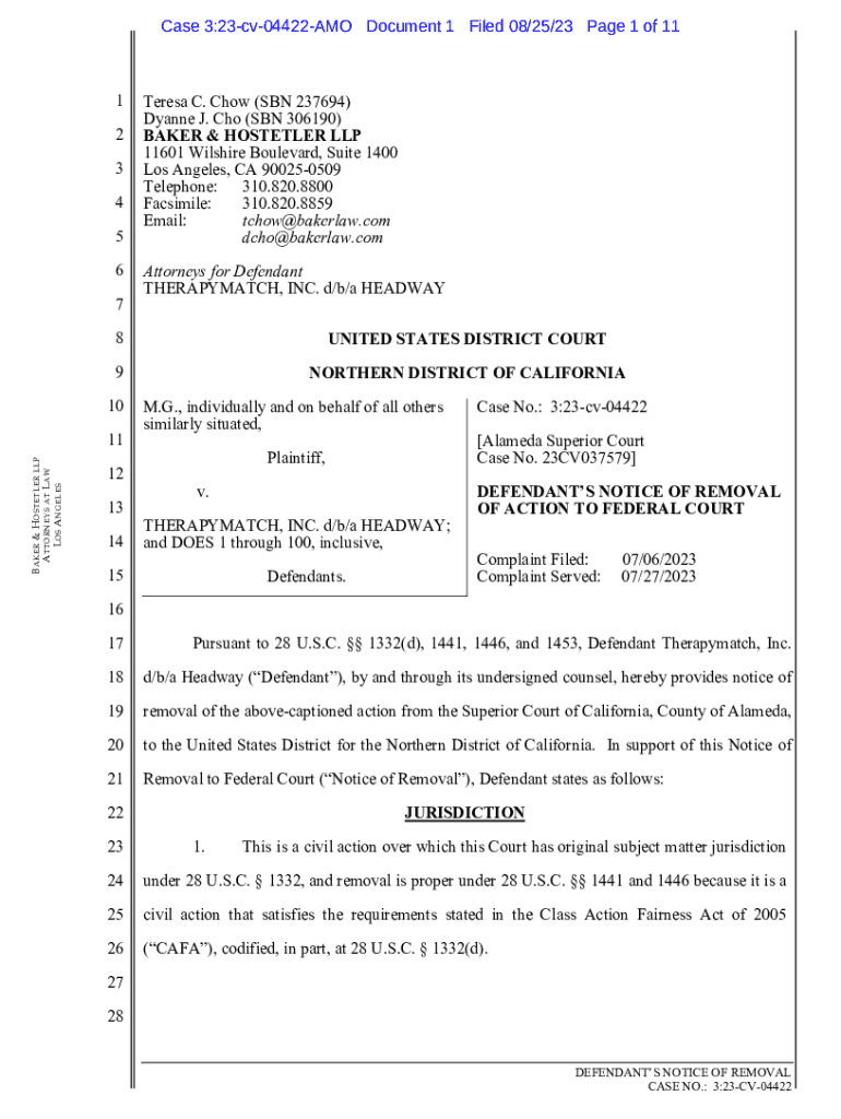 Case 3:23cv04422AMO Document 1 Filed 08/25/23 Page 1 of 111 2 3 4 5 6 7Attorneys for Defendant THERAPYMATCH, INC. d/b/a HEADWAY8UNITED STATES DISTRICT COURT9NORTHERN DISTRICT OF CALIFORNIA10 11 B AKER & H OSTETLER LLP A TTORNEYS AT L A W L OS A NGELESTeresa C. Chow (SBN 237694) Dyanne J. Cho (SBN 306190) BAKER & HOSTETLER LLP 11601 Wilshire Boulevard, Suite 1400 Los Angeles, CA 900250509 Telephone: 310.820.8800 Facsimile: 310.820.8859 Email: tchow@bakerlaw.com dcho@bakerlaw.com12 13 14M