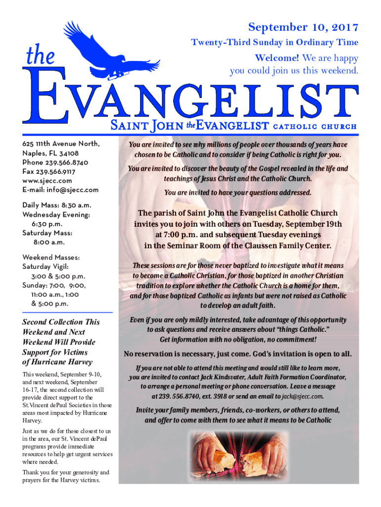 September 10, 2017 TwentyThird Sunday in Ordinary TimeWelcome! We are happy you could join us this weekend.625 111th Avenue North, Naples, FL 34108 Phone 239.566.8740 Fax 239.566.9117 www.sjecc.com Email: info@sjecc.com Daily Mass: 8:30 a.m. Wednesday Evening: 6:30 p.m. Saturday Mass: 8:00 a.m. Weekend Masses: Saturday Vigil: 3:00 & 5:00 p.m. Sunday: 7:00, 9:00, 11:00 a.m., 1:00 & 5:00 p.m.Second Collection This Weekend and Next Weekend Will Provide Support for Victims of Hurricane Harvey This