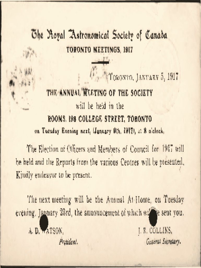 R oyal Astronomical S o ciety of Canada TO R O N T O M EE T IN G S , 1917 T o r o n t o , J a n u a r y 5 , 1917 theAn n u a l Me e t i n gof theSo c ie t ywill be held in the ROOMS, 198 COLLEGE STR