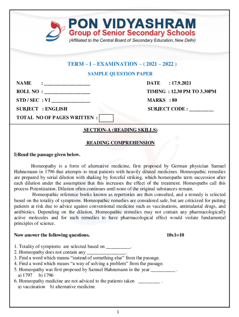 Get the free Term I Examination Sample Question Paper