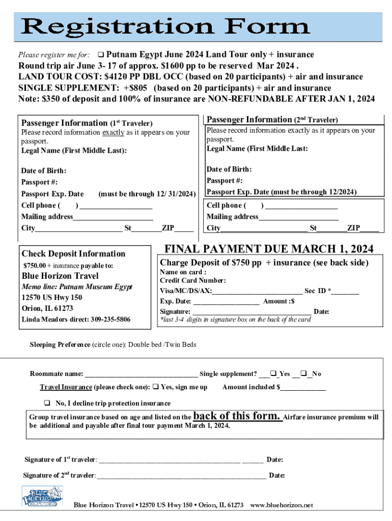 Please register me for: Putnam Egypt June 2024 Land Tour only + insuranceRound trip air June 3 17 of approx. $1600 pp to be reserved Mar 2024 . LAND TOUR COST: $4120 PP DBL OCC (based on 20 participants)
