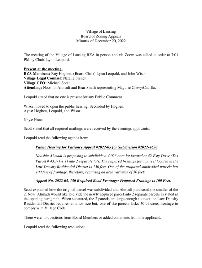 Detailed minutes from the Village of Lansing BZA meeting held on December 20, 2022, covering key discussions, resolutions, and variances including appeals related to residential and commercial properties.