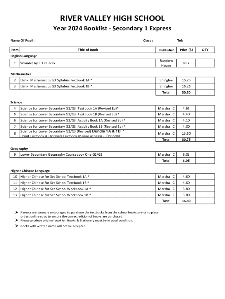 Get the free Year 2024 Booklist - Secondary 1 Express