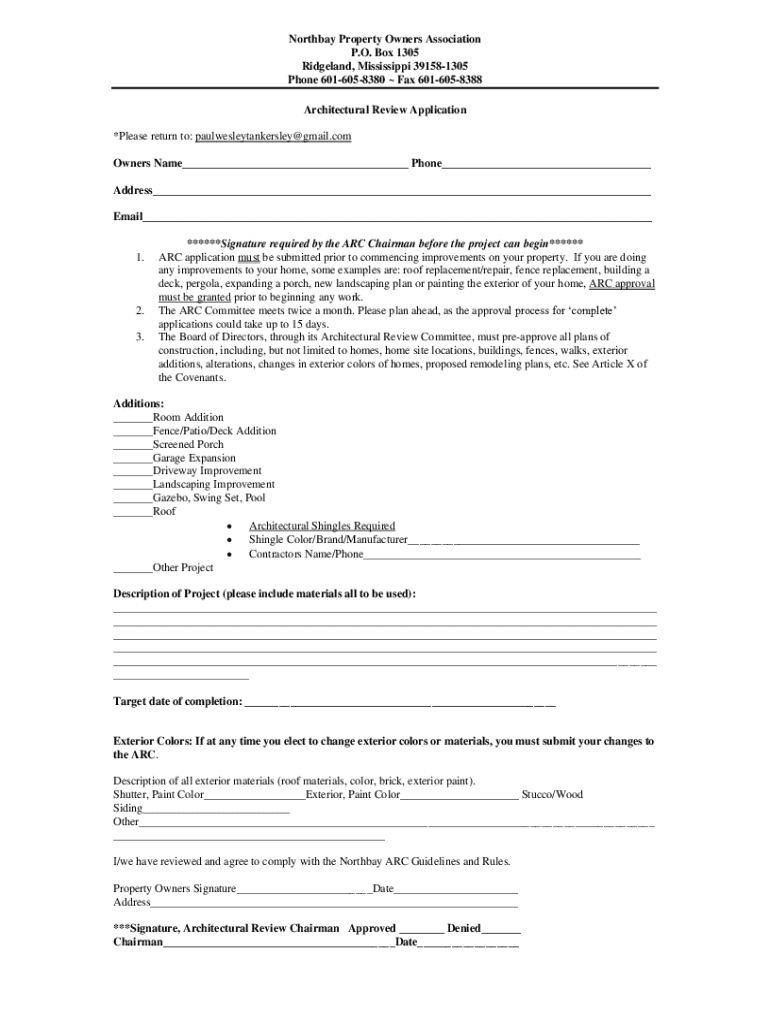 Northbay Property Owners Association P.O. Box 1305 Ridgeland, Mississippi 391581305 Phone 6016058380 Fax 6016058388 Architectural Review Application *Please return to: paulwesleytankersley@gmail.com