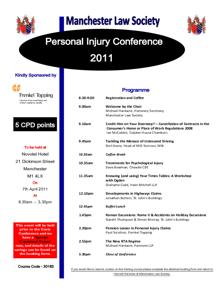 Register for the Personal Injury Conference 2011 in Manchester, covering critical topics in personal injury law and offering CPD points. Reserve your place today!