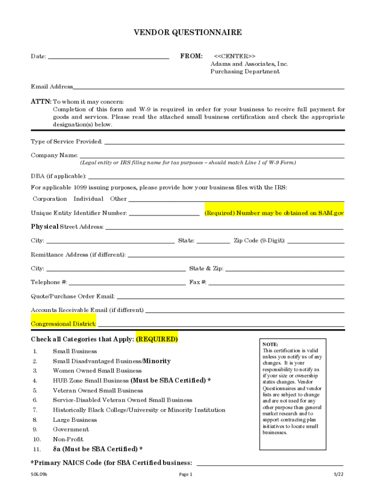 Complete the Vendor Questionnaire for Adams and Associates, Inc. to ensure your business receives full payment and to certify small business status.