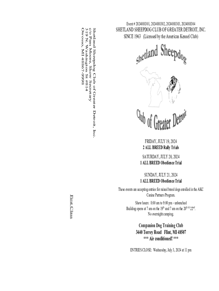 Event # 2024088301, 2024088302, 2024088303, 2024088304Shetland Sheepdog Club of Greater Detroit, Inc. c/o Pam Moore, Show Secretary 319 N. Washington St #814 Owosso, MI 488679998SHETLAND SHEEPDOG