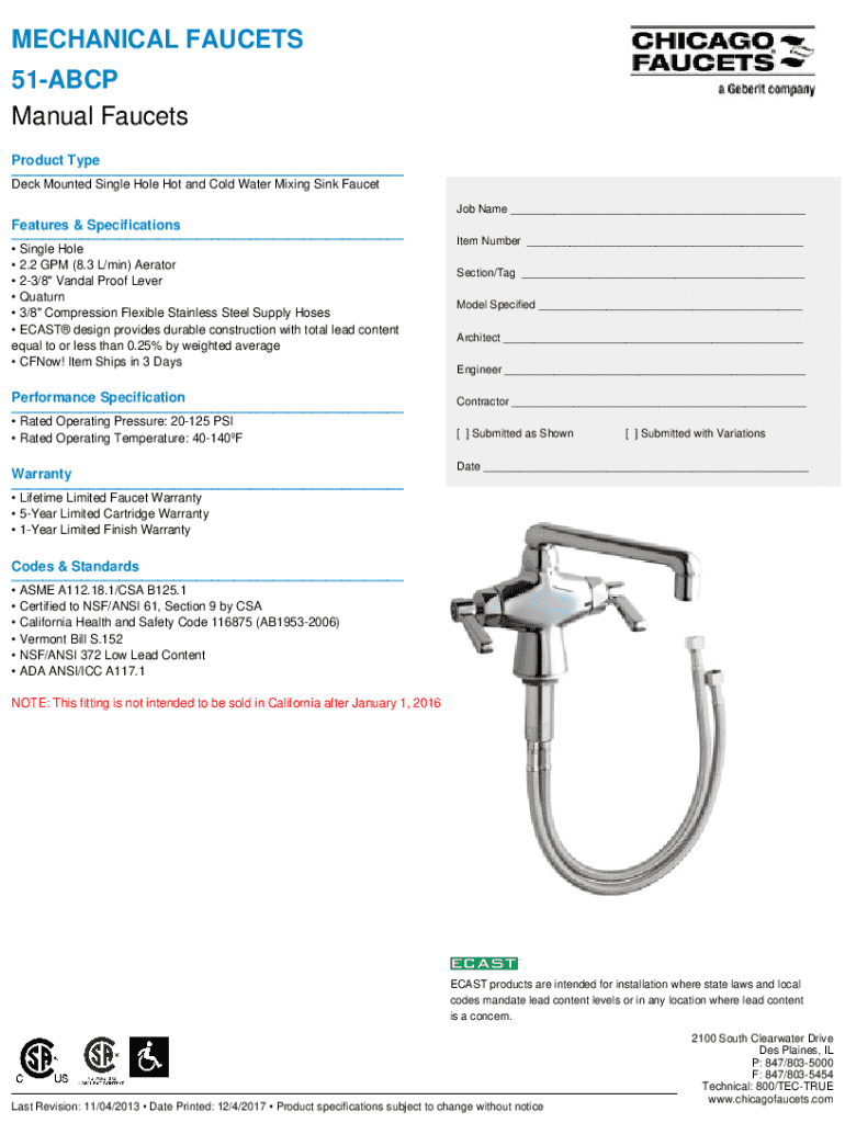 Explore the specifications of the 51-ABCP Manual Faucet, a deck-mounted sink faucet designed for durability and compliance with ADA and lead content standards.