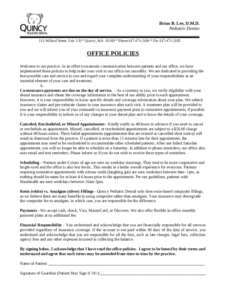 The Office Policies is a document which can be filled-out and signed for specified needs. In that case, it is provided to the actual addressee to provide certain information and data. The completion and signing is available in hard copy by hand or via an appropriate application like PDFfiller. Such tools help to fill out any PDF or Word file without printing out. It also allows you to edit it according to your needs and put an official legal digital signature. Once you're good, you send the Office Policies to the recipient or several recipients by mail and also fax. PDFfiller offers a feature and options that make your document of MS Word extension printable. It has a number of settings for printing out. It doesn't matter how you will deliver a form - physically or by email - it will always look well-designed and firm. To not to create a new document from scratch again and again, make the original form as a template. After that, you will have a customizable sample.