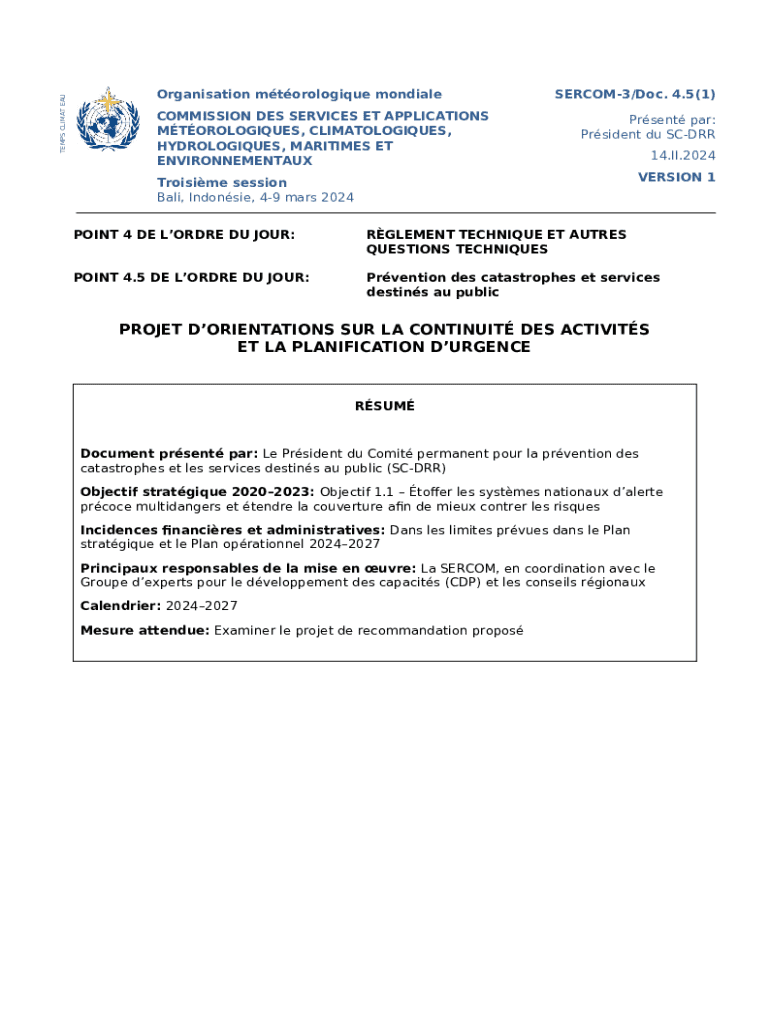 The Weather, Climate, Marine and Hydrological Services is a fillable form in MS Word extension which can be filled-out and signed for certain reasons. Next, it is furnished to the exact addressee to provide some information of any kinds. The completion and signing is available manually or using a suitable tool like PDFfiller. Such services help to complete any PDF or Word file without printing them out. While doing that, you can edit its appearance for the needs you have and put a valid e-signature. Upon finishing, you send the Weather, Climate, Marine and Hydrological Services to the recipient or several of them by mail and also fax. PDFfiller provides a feature and options that make your template printable. It includes various options when printing out. It doesn't matter how you will file a form - in hard copy or electronically - it will always look professional and firm. To not to create a new writable document from scratch all the time, make the original document into a template. Later, you will have a customizable sample.