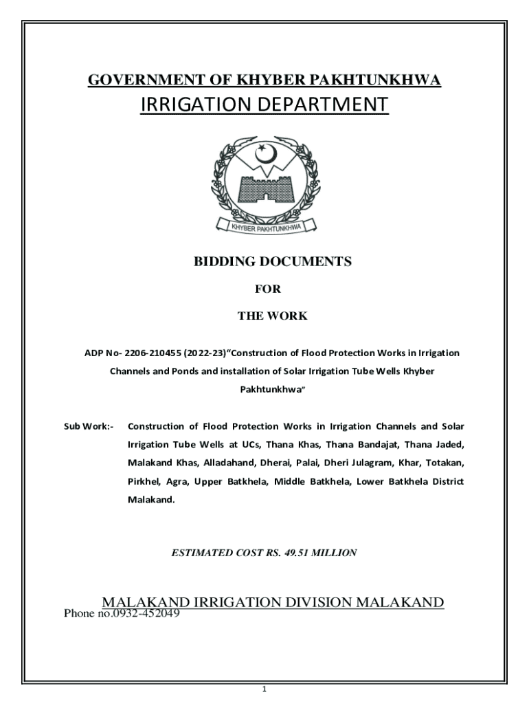 GOVERNMENT OF KHYBER PAKHTUNKHWAIRRIGATION DEPARTMENTBIDDING DOCUMENTS FOR THE WORK ADP No 2206210455 (202223)Construction of Flood Protection Works in Irrigation Channels and Ponds and installation of Solar Irrigation Tube Wells Khyber PakhtunkhwaSub Work:Construction of Flood Protection Works in Irrigation Channels and Solar Irrigation Tube Wells at UCs, Thana Khas, Thana Bandajat, Thana Jaded, Malakand Khas, Alladahand, Dherai, Palai, Dheri Julagram, Khar, Totakan, Pirkhel, Agra,