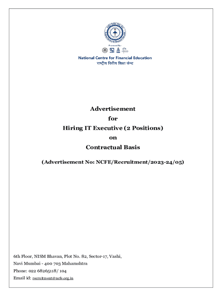 Advertisement for Hiring IT Executive (2 Positions) on Contractual Basis (Advertisement No: NCFE/Recruitment/202324/05)6th Floor, NISM Bhavan, Plot No. 82, Sector17, Vashi, Navi Mumbai 400 703 Maharashtra