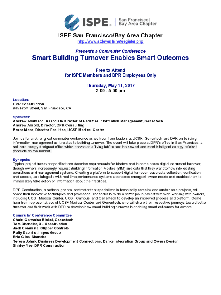ISPE San Francisco/Bay Area Chapter http://www.atdevents.net/register.phpPresents a Commuter ConferenceSmart Building Turnover Enables Smart Outcomes Free to Attend for ISPE Members and DPR Employees