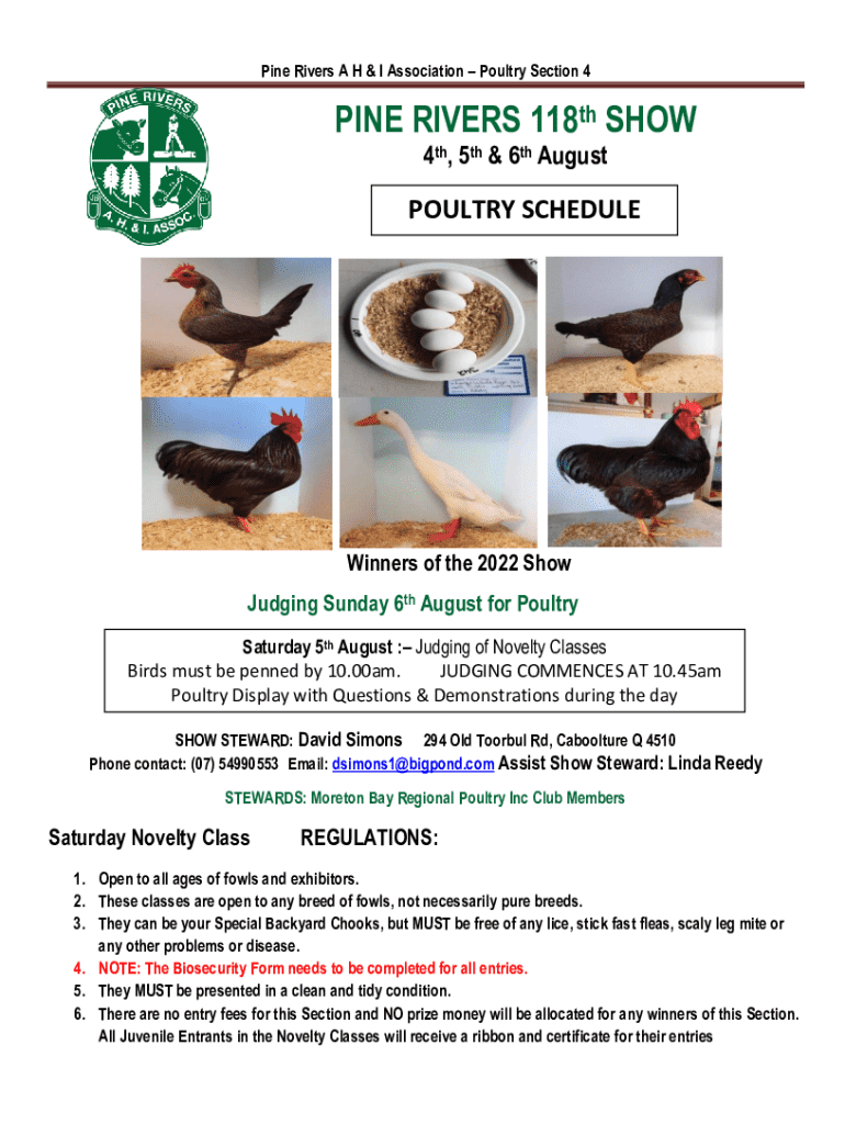 Discover the details of the Pine Rivers 118th Poultry Show, including judging schedules, class entries, and biosecurity regulations for a successful exhibition.