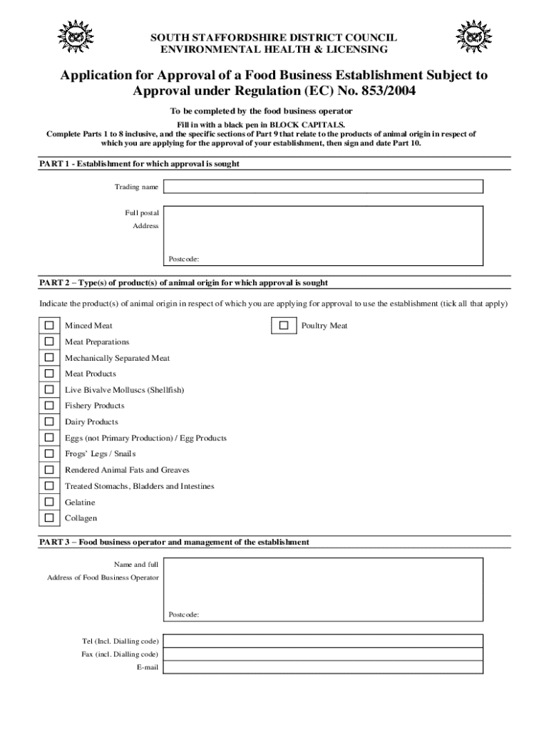SOUTH STAFFORDSHIRE DISTRICT COUNCIL ENVIRONMENTAL HEALTH & LICENSINGApplication for Approval of a Food Business Establishment Subject to Approval under Regulation (EC) No. 853/2004 To be completed