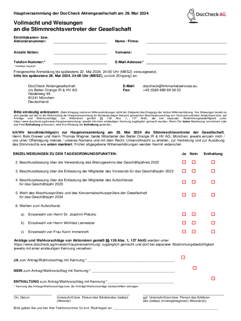 Hauptversammlung her Check Aktiengesellschaft am 29. Mai 2024Vollmacht UND Wastage