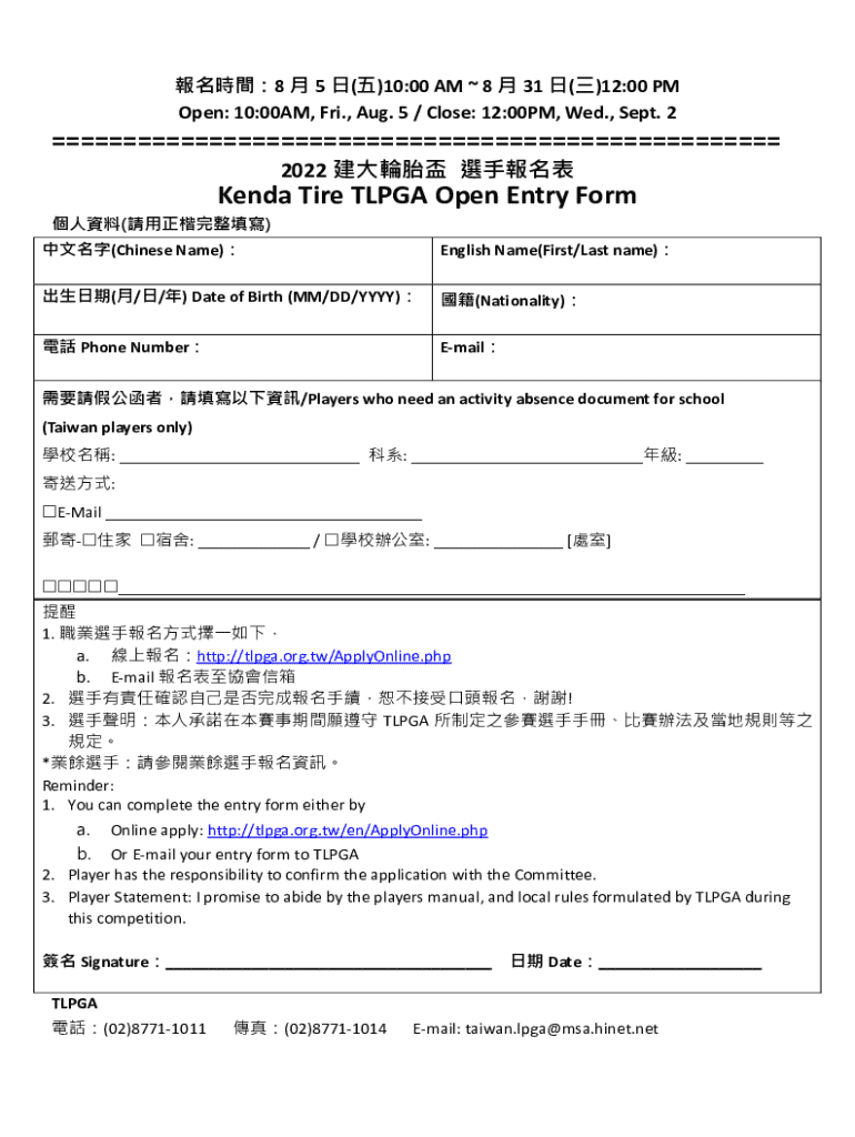 The TLPGA Open Entry Form is a document used by participants to register for the TLPGA tournament.