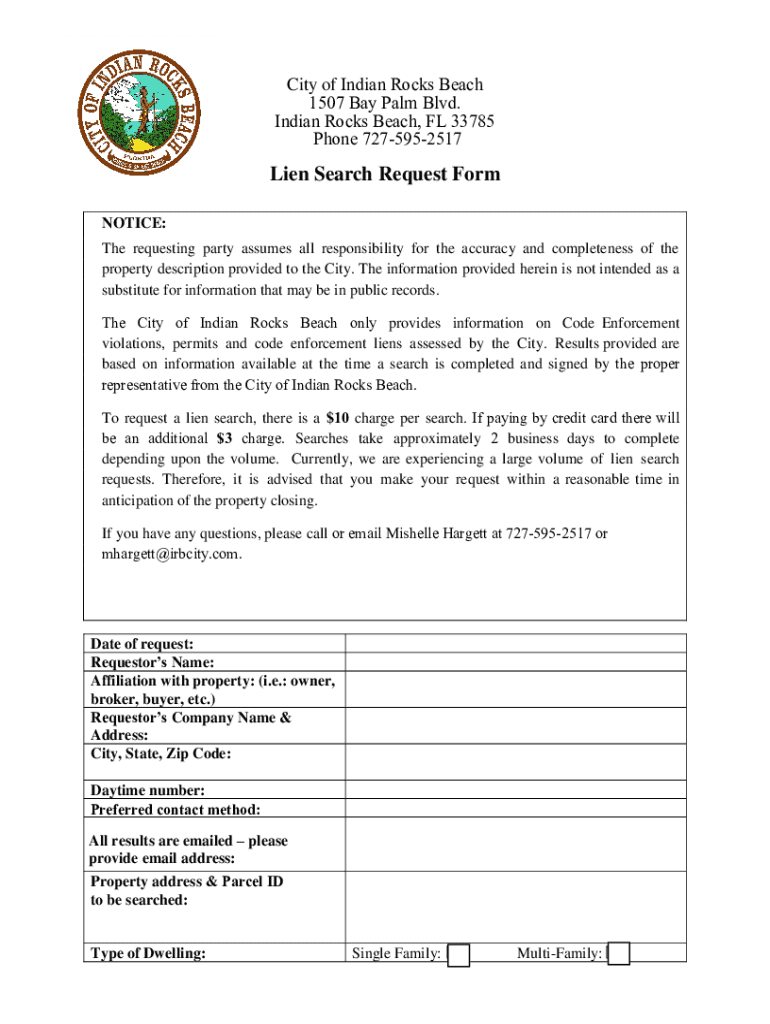 Request a lien search for properties in Indian Rocks Beach. The process includes a fee and takes about 2 business days, ensuring all requests are handled responsibly.