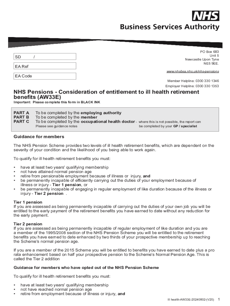 DPO Box 683 Unit 5 Newcastle Upon Type NE5 9EE./EA Reflow.nhsbsa.nhs.uk/nhspensionsEA December Helpline: 0300 330 1346 Employer Helpline: 0300 330 1353NHS Pensions Consideration of entitlement to ill health retirement benefits (AW33E) Important: Please complete this form in BLACK IMPART A PART B PART CTO be completed by the employing authority To be completed by the member To be completed by the occupational health doctor where this is not possible, the report please