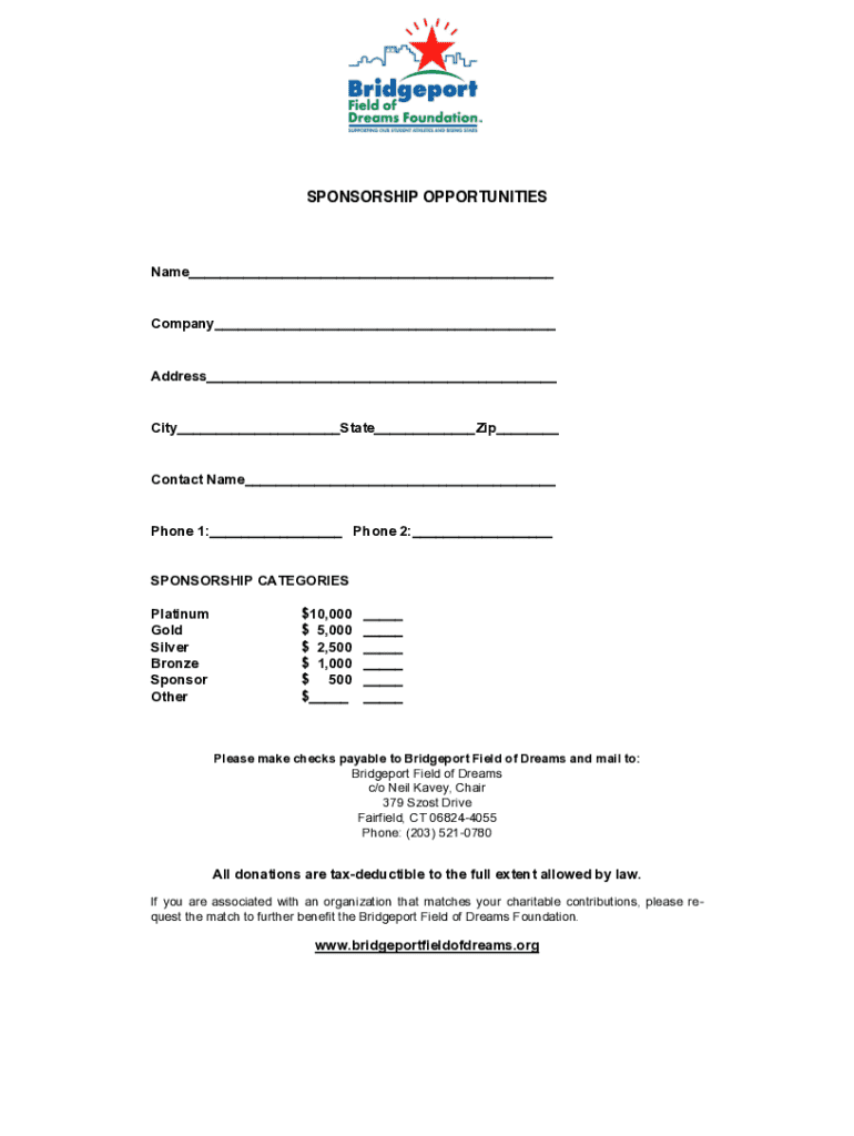 SPONSORSHIP OPPORTUNITIESName___Company___Address___City___State___Zip___Contact Name___Phone 1:___ Phone 2:___ SPONSORSHIP CATEGORIES Platinum Gold Silver Bronze Sponsor Other$10,000 $ 5,000 $ 2,500