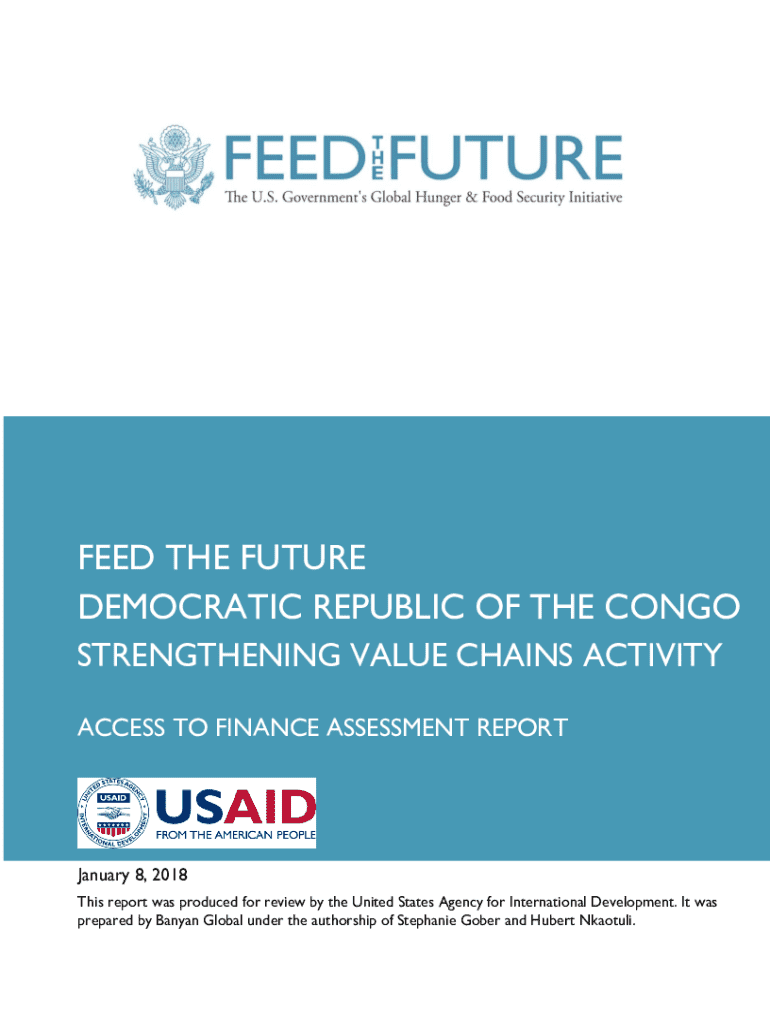 FEED THE FUTURE DEMOCRATIC REPUBLIC OF THE CONGO STRENGTHENING VALUE CHAINS ACTIVITY ACCESS TO FINANCE ASSESSMENT REPORTJanuary 8, 2018 This report was produced for review by the United States Agency for International Development. It was prepared by Banyan Global under the authorship of Stephanie Gober and Hubert Nkaotuli.Prepared for the United States Agency for International Development, USAID Contract Number AID660C1700003, Feed the Future Democratic of the Congo Strengthening Value Chains...