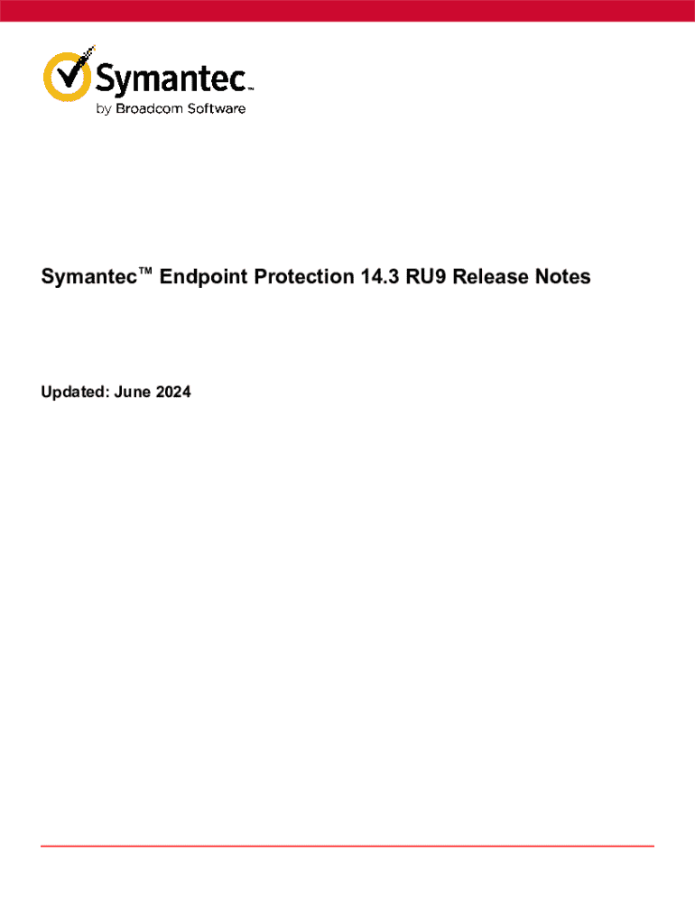 Symantec Endpoint Protection 14.3 RU9 Release NotesUpdated: June 2024Symantec Endpoint Protection 14.3 RU9 Release NotesTable of Contents What\'s new for Symantec Endpoint Protection 14.3 RU9?............................................................. 3 System requirements for Symantec Endpoint Protection (SEP) 14.3 RU9.................................... 8 Known issues and workarounds for Symantec Endpoint Protection (SEP)................................ 17 Supported and unsupported