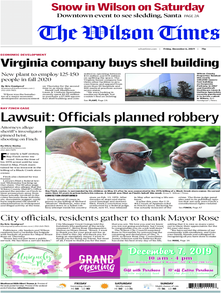 Snow in Wilson on Saturday Downtown event to see sledding, SantaPAGE 2AThe Wilson Times wilsontimes.com |Friday, December 6, 2019 |75ECONOMIC DEVELOPMENTVirginia company buys shell building New plant to employ 125150 people in fall 2020 By Brie Handgraaf bhandgraaf@wilsontimes.com | 2522657821Wilson was the benefactor of a major economic development announcementon Thursday for the second time in as many days. HandCraft Healthcare Linen & Uniform Specialists recently spent $2
