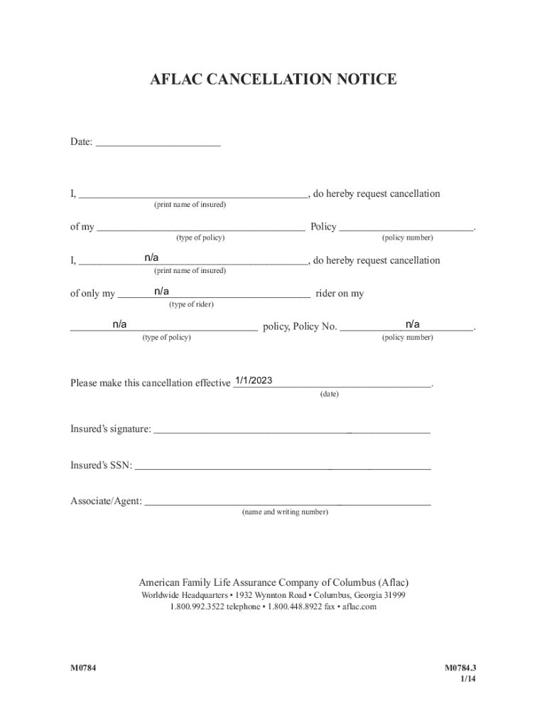 Get the free Aflac Cancellation Notice