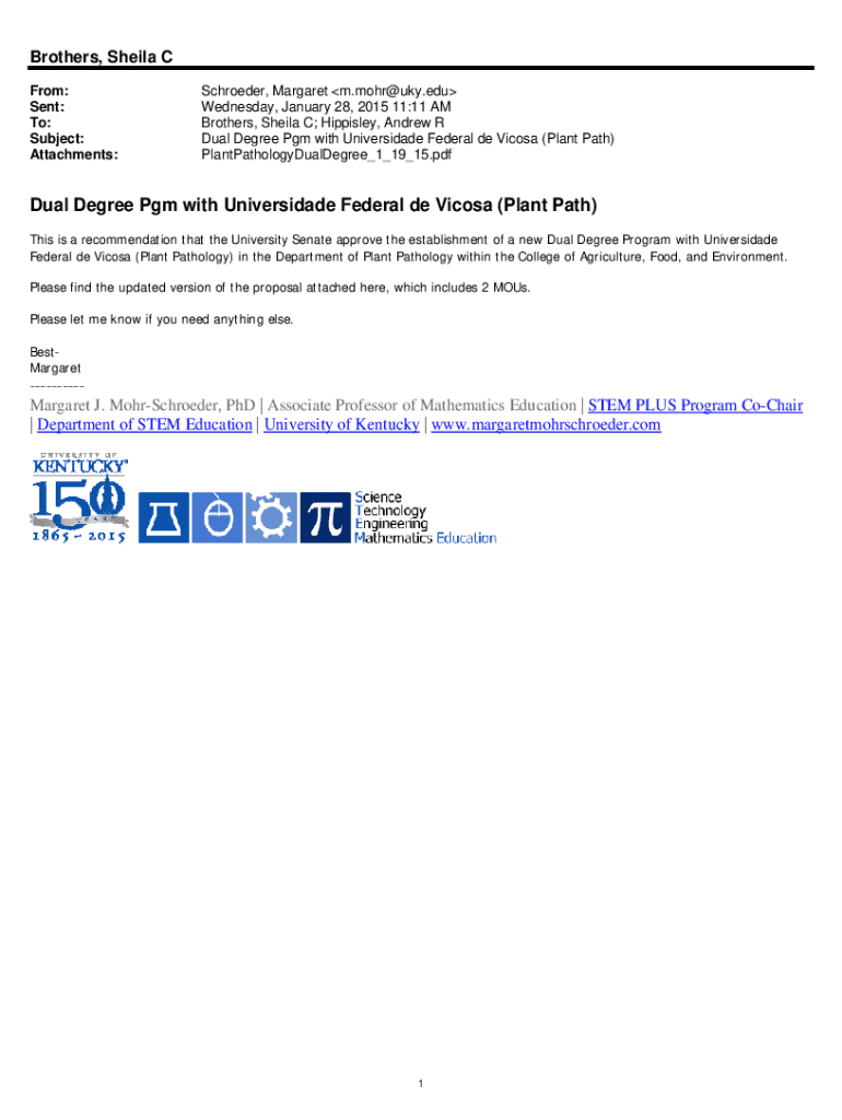 Brothers, Sheila C From: Sent: To: Subject: Attachments:Schroeder, Margaret m.mohr@uky.edu Wednesday, January 28, 2015 11:11 AM Brothers, Sheila C; Hippisley, Andrew R Dual Degree Pgm with Universidade Federal de Vicosa (Plant Path) PlantPathologyDualDegree_1_19_15.pdfDual Degree Pgm with Universidade Federal de Vicosa (Plant Path) This is a recommendation that the University Senate approve the establishment of a new Dual Degree Program with Universidade Federal de Vicosa (Plant Pathology)