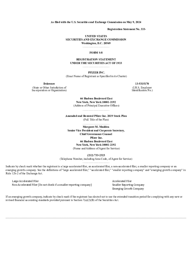 This document registers 320 million shares of common stock under the Pfizer Inc. Amended and Restated 2019 Stock Plan, approved by shareholders in 2024.