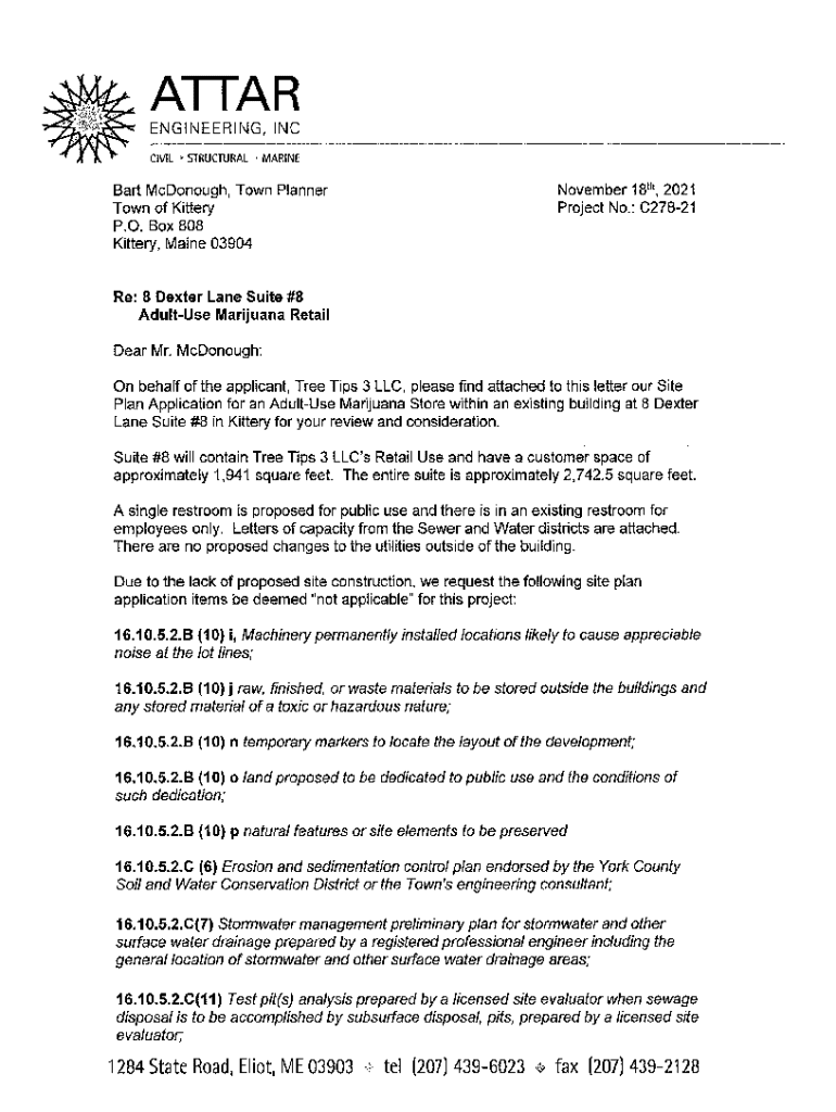 Brian NielsenWAIVER REQUEST Describe why this request is being made.***EXAMPLE*** 16.32.560 (B) OFFSTREET PARKING.***EXAMPLE*** Requesting a waiver of this ordinance since the proposed professional offices have a written agreement with the abutting Church owned property to share parking.DESCRIPTIONOrdinance SectionRelated Kittery Land Use Code concerning waivers and modifications: 16.10.8.2.5 Conditions or Waivers. Conditions required by the Planning Board at the final plan review