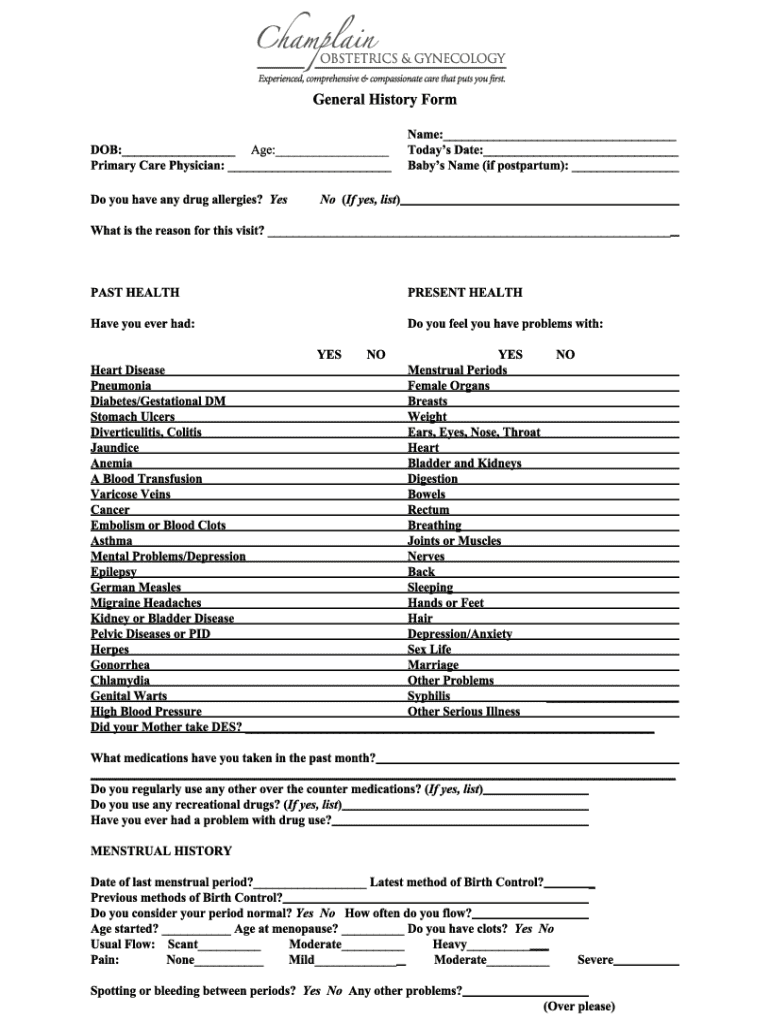 Comprehensive medical history form capturing personal and family health details, including screenings and lifestyle habits for better health management.
