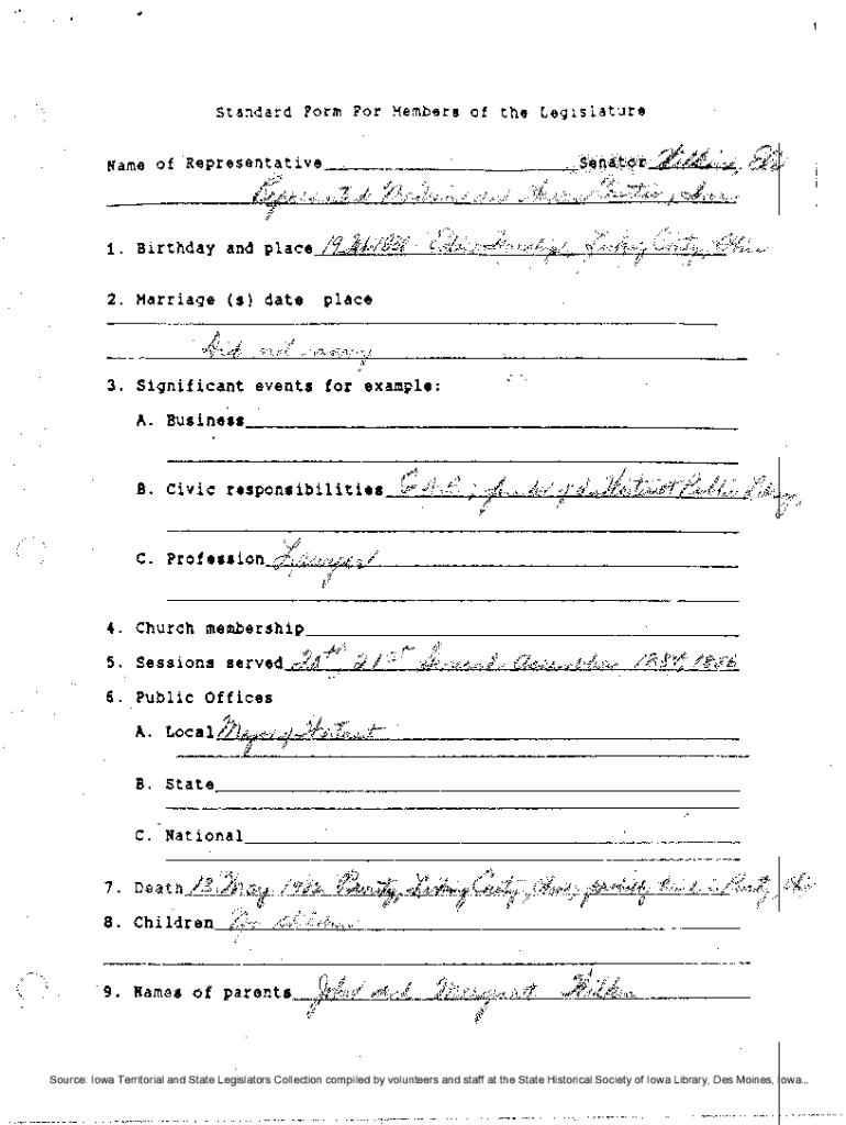 .. Standard Form ForMembrsof the Le91slatureName of1. Birthday and pl2. Marriaqe (s) dateplace,,,\'?L,/\'#\" *\"/:/r\'f,tv/l_.t/f:i\"3. Siqnificant events for example: A. Business ___c. Professionc..1:;t.t/____6. Public Offices A. Local J21.,.,;v 4.,/.:t;,.4.t ,.\"B. State ___ \'c. National ___.t. );_uoc.!.7 De a thL...J.8. Children \'2);: .c/:(\",t;,?,, ltSource: